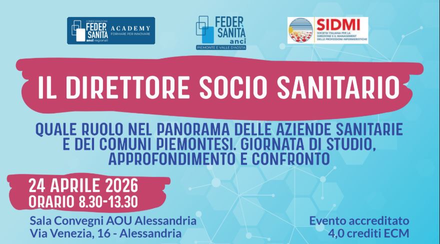 Il 24 aprile 2026, dalle 8:30 alle 13:30, presso la Sala Convegni AOU Alessandria in Via Venezia 16, si terrà la giornata di studio “Il Direttore socio sanitario. Quale ruolo nel panorama delle aziende sanitarie e dei Comuni piemontesi”, promossa nell’ambito delle attività di Federsanità ANCI Piemonte e Valle d’Aosta, con il coinvolgimento di Federsanità Academy e SIDMI. L’evento è accreditato ECM e riconosce 4,0 crediti