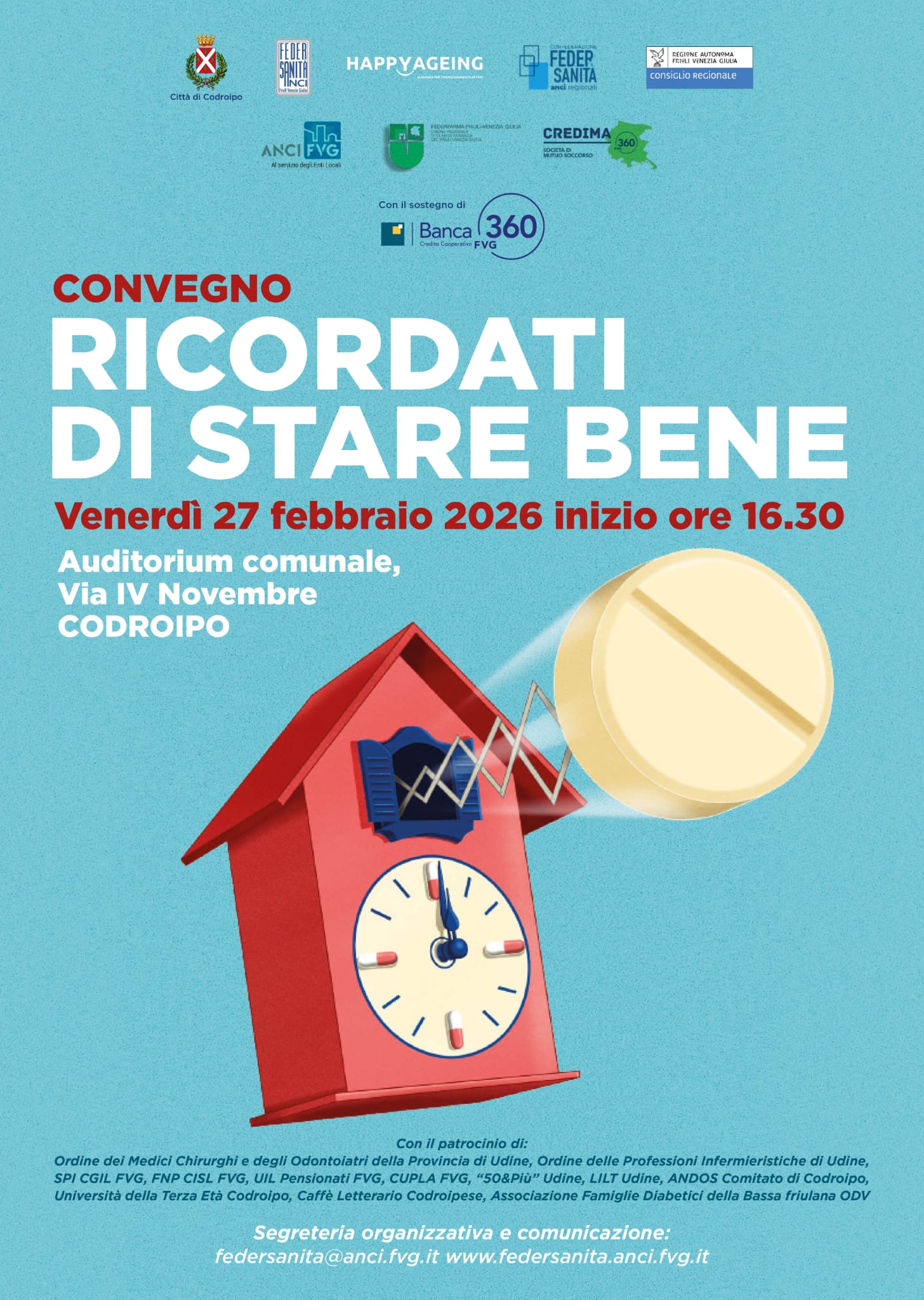 Venerdì 27 febbraio 2026, alle ore 16.30, l’Auditorium comunale di Codroipo (Via IV Novembre) ospiterà una nuova tappa della campagna “Ricordati di stare bene”, promossa da Happy Ageing in collaborazione con Federsanità ANCI Friuli Venezia Giulia.