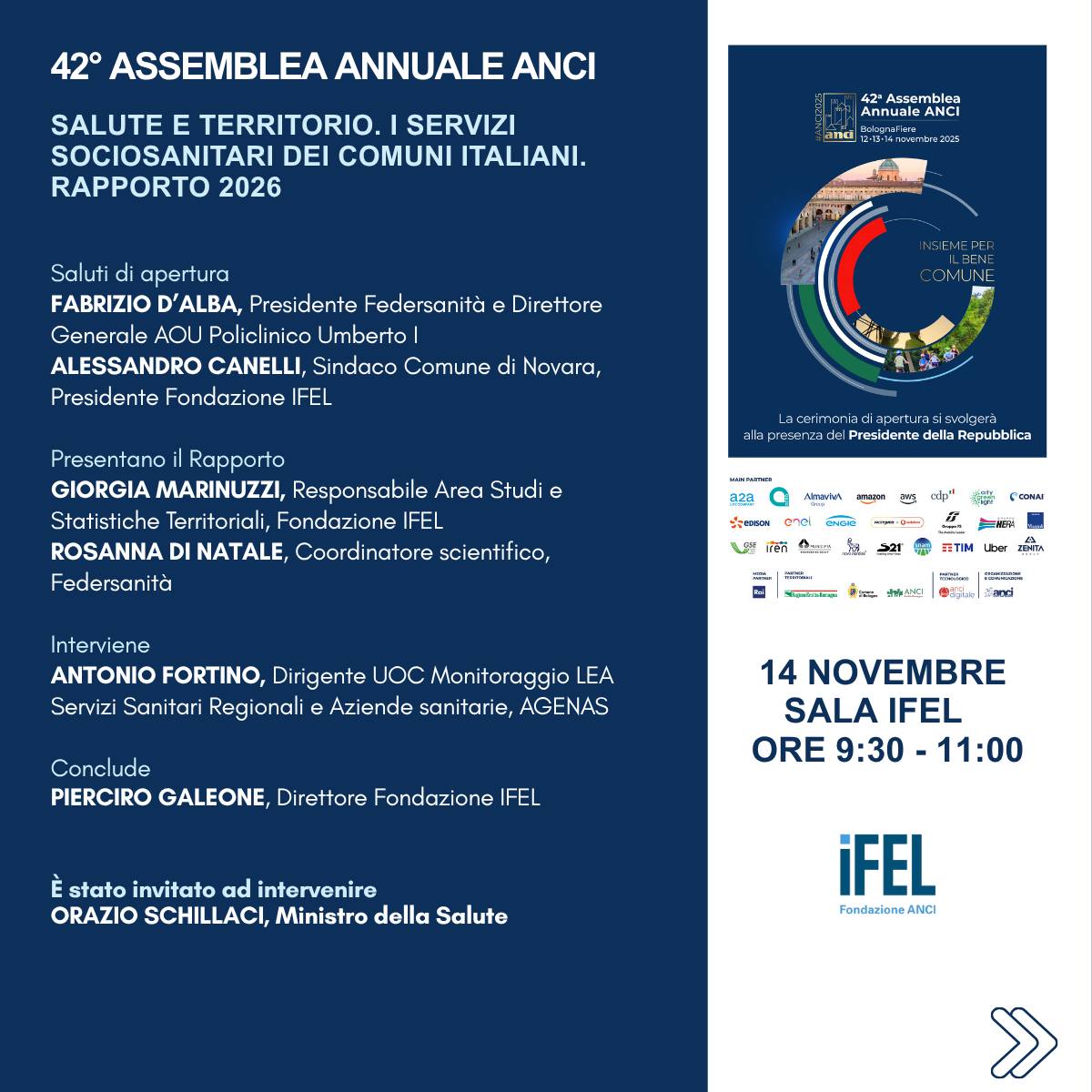 Venerdì 14 novembre 2025 dalle ore 9:30 alle ore 11:00, in occasione della 42ª Assemblea Annuale ANCI, Federsanità e IFEL presentano la quarta edizione del volume “Salute e territorio. I servizi sociosanitari dei comuni italiani”, un importante strumento di analisi e riflessione sul rapporto tra salute, sanità e territorio.
